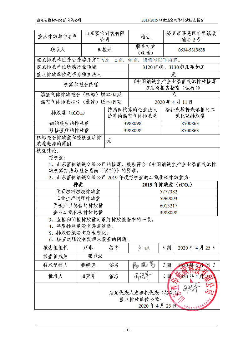 山东富伦钢铁有限公司2019年度温室气体排放核查报告